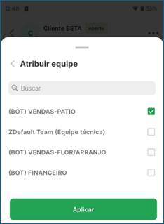 - Use somente as equipes: (BOT) VENDAS-FLOR/ARRANJO, (BOT) VENDAS-PATIO e (BOT) FINANCEIRO.